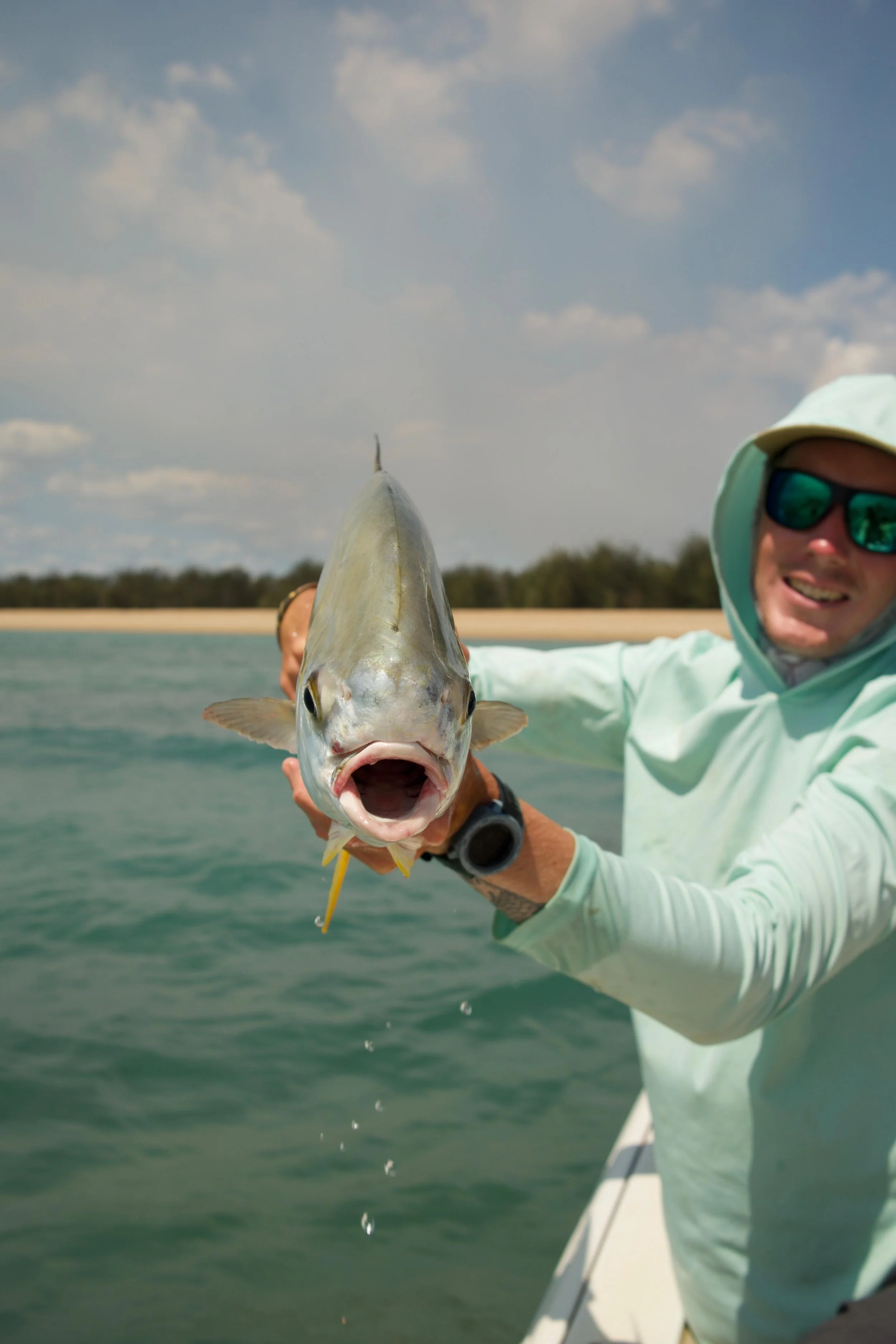 From sight fishing ultra-shallow, mangrove-lined mud flats for Barramundi and King Threadfin Salmon, to stalking crystal-clear flats for Blue Bastards, Blackspot Tuskfish, and T. anak Permit, through to offshore bait balls being torn apart by a wide range of pelagic sportfish, the opportunities are endless.